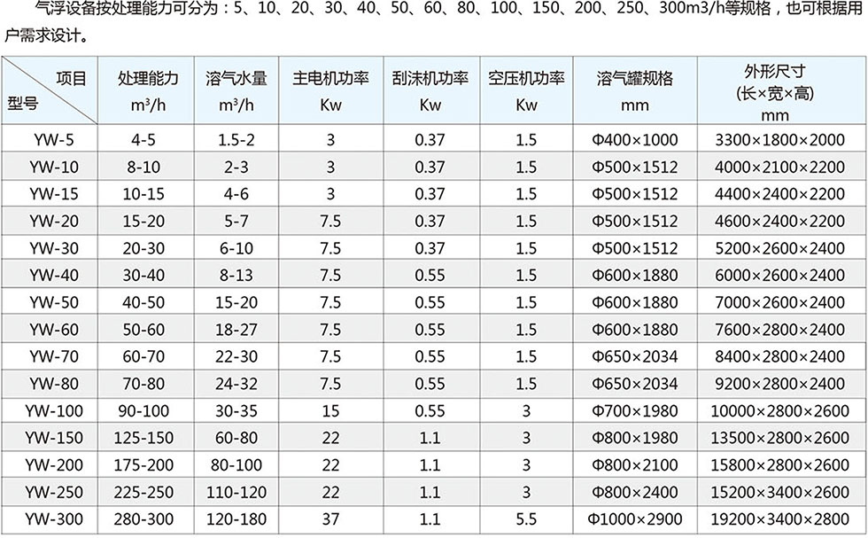 | 備注:考慮運輸的方便處理水量超出100m3/h需現場制作,設備外型尺寸可根據用戶現場情況定制。 | |||||